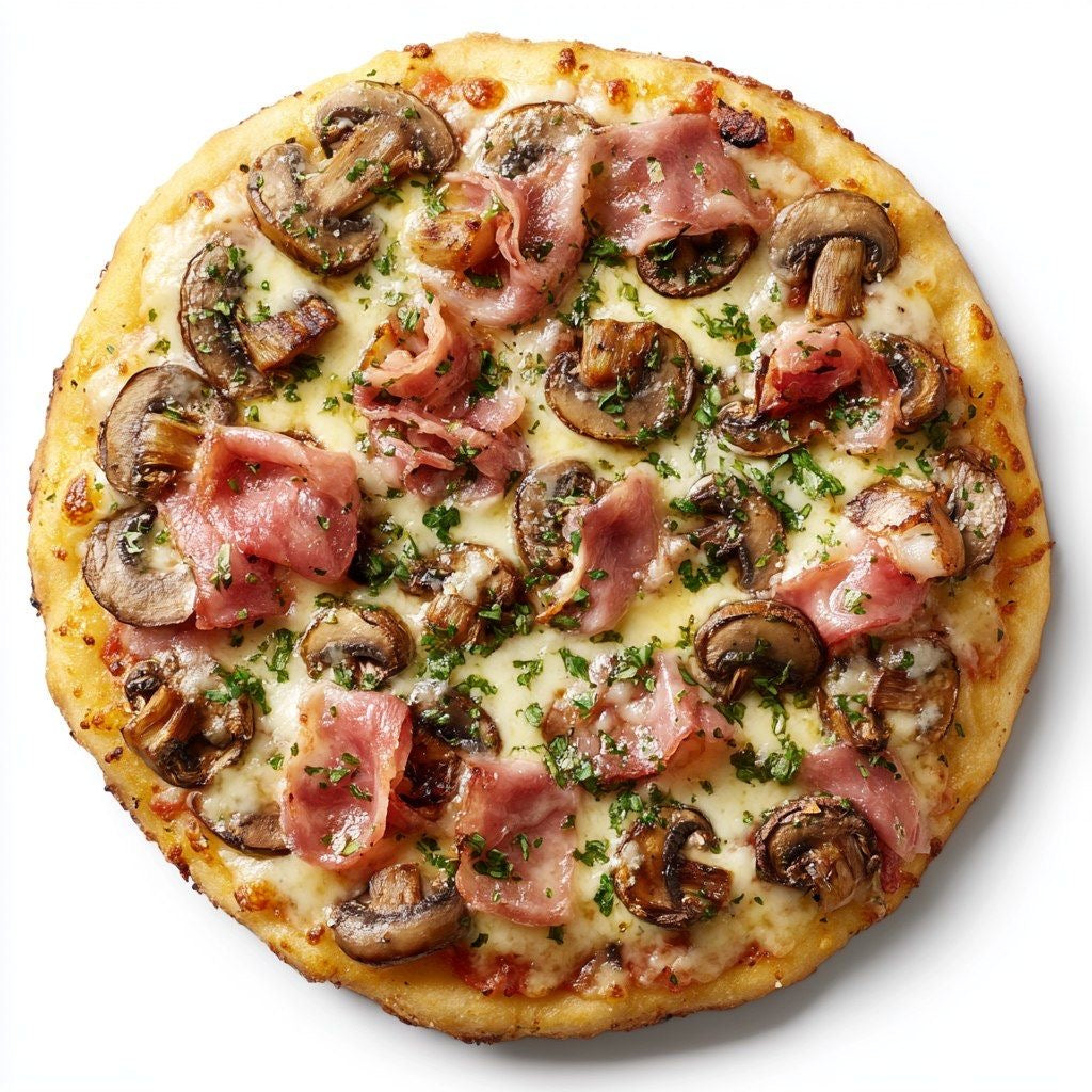 Mozza, jambon, champignons, olives, origan